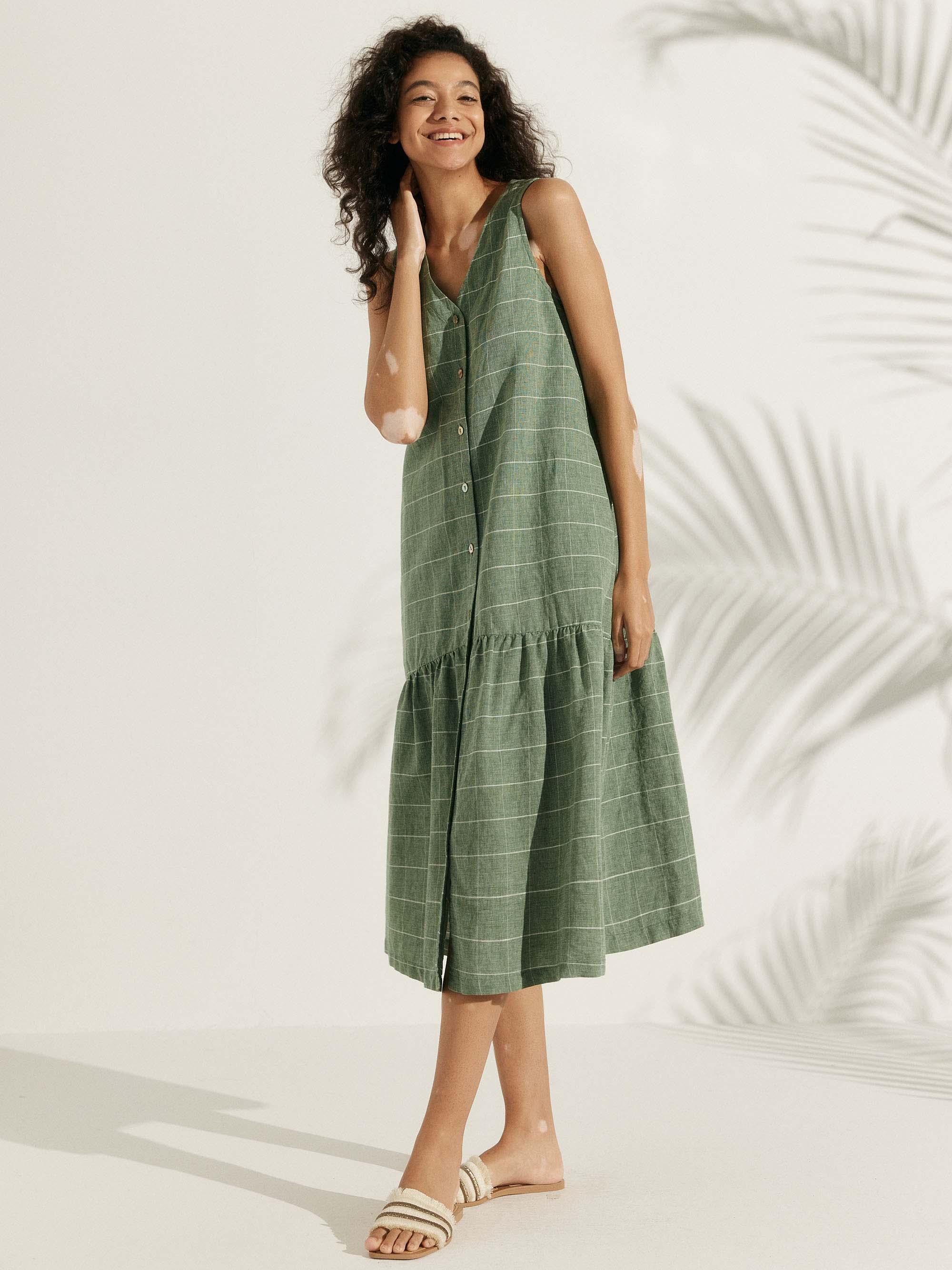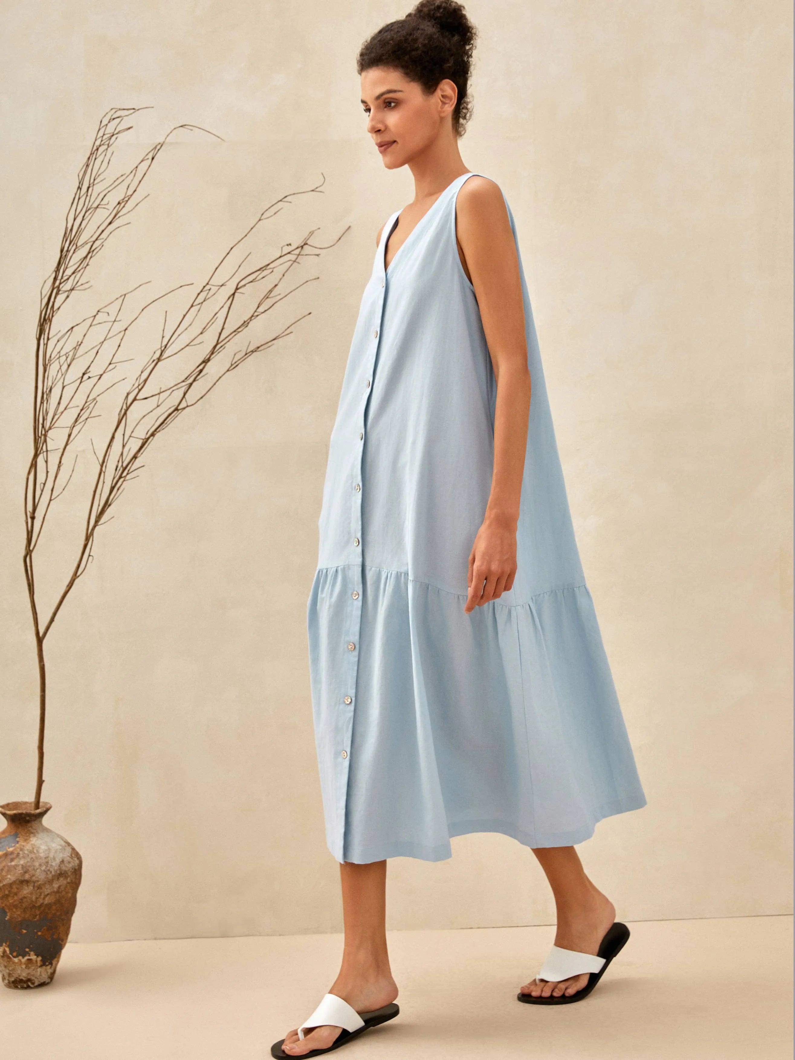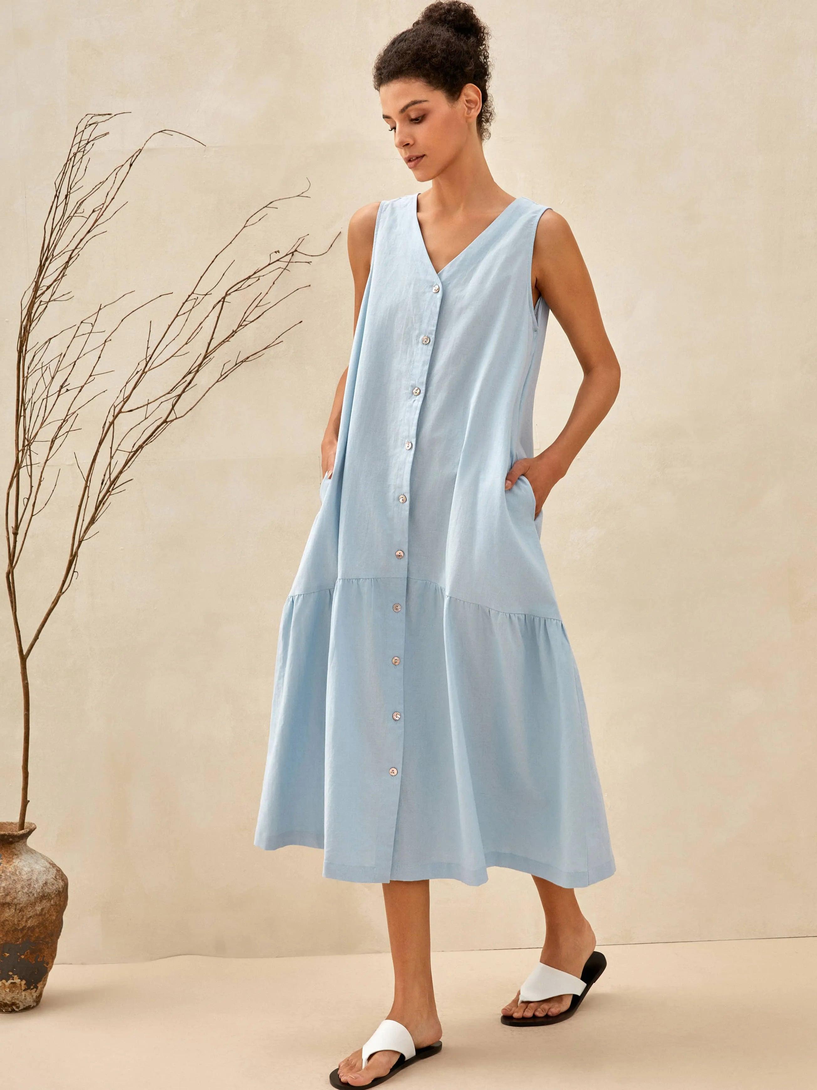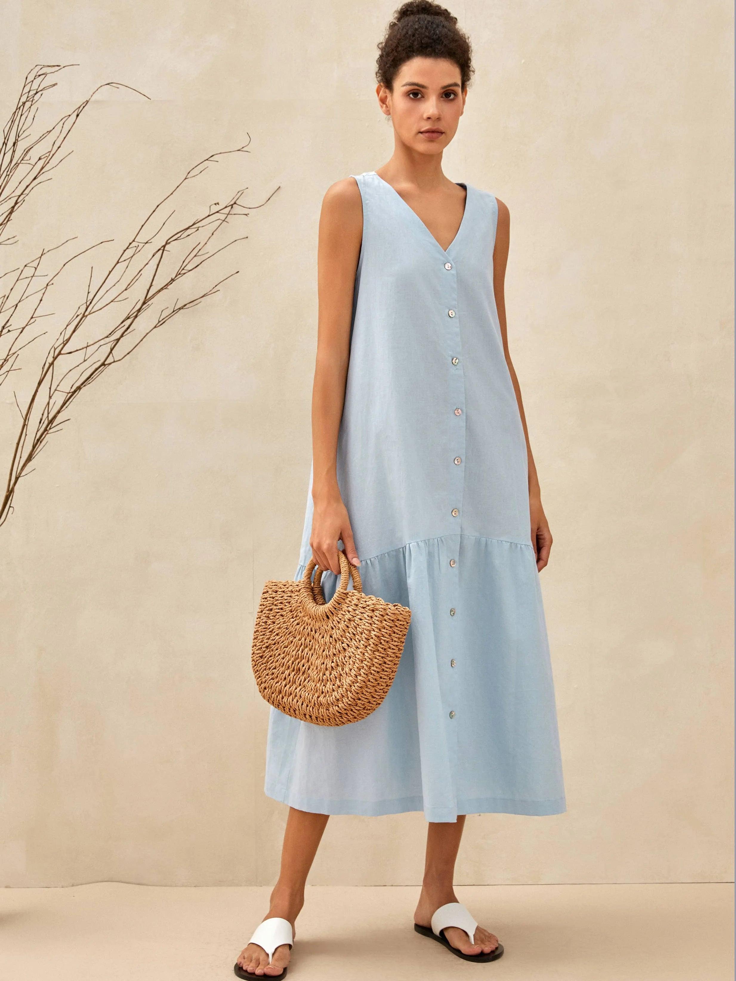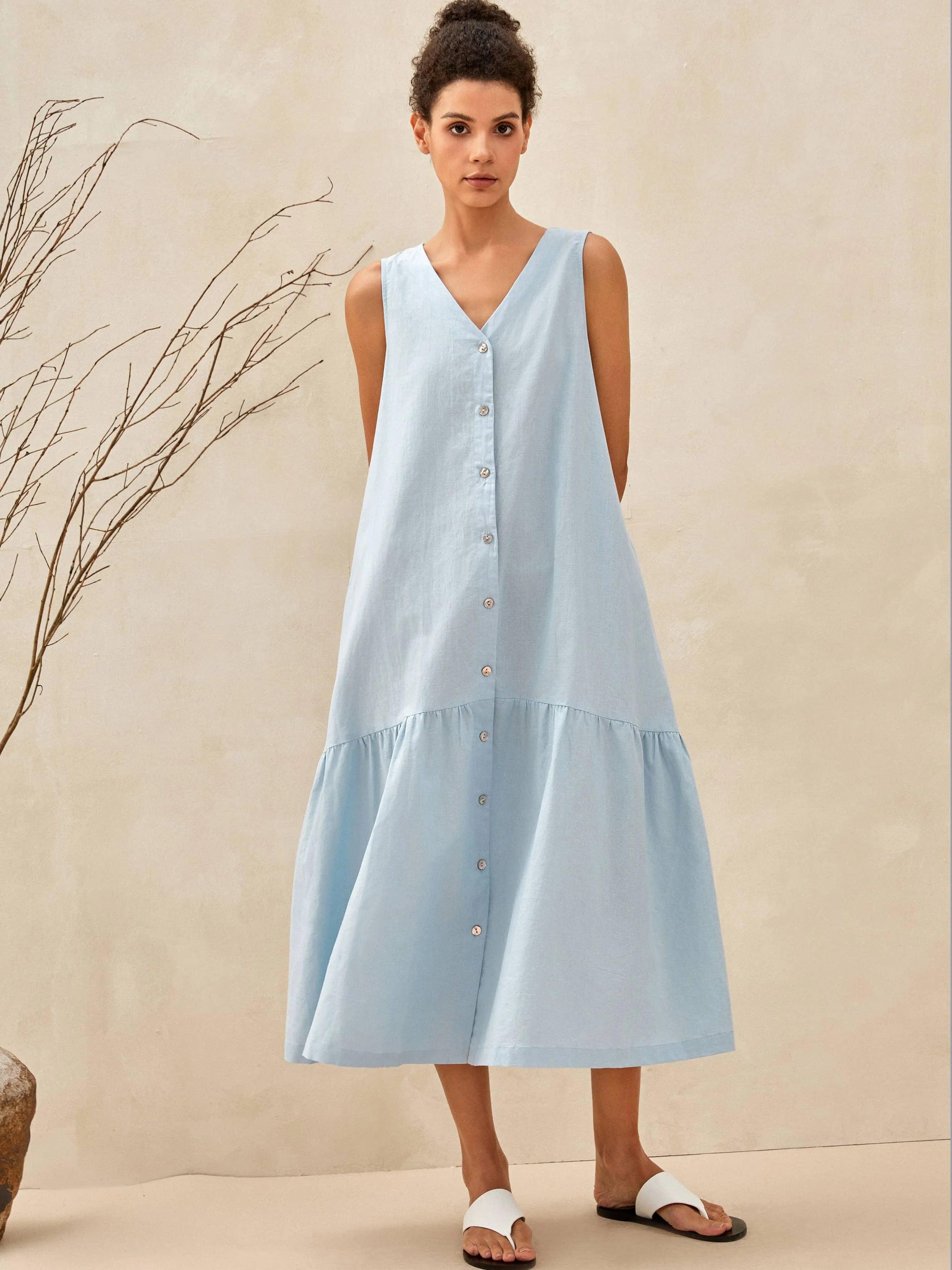 Linen Vacation Sleeveless V-Neck Mid-Length Dress CELINE