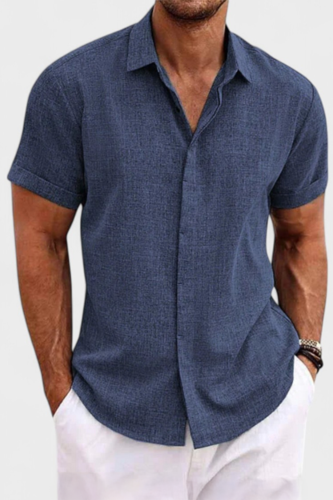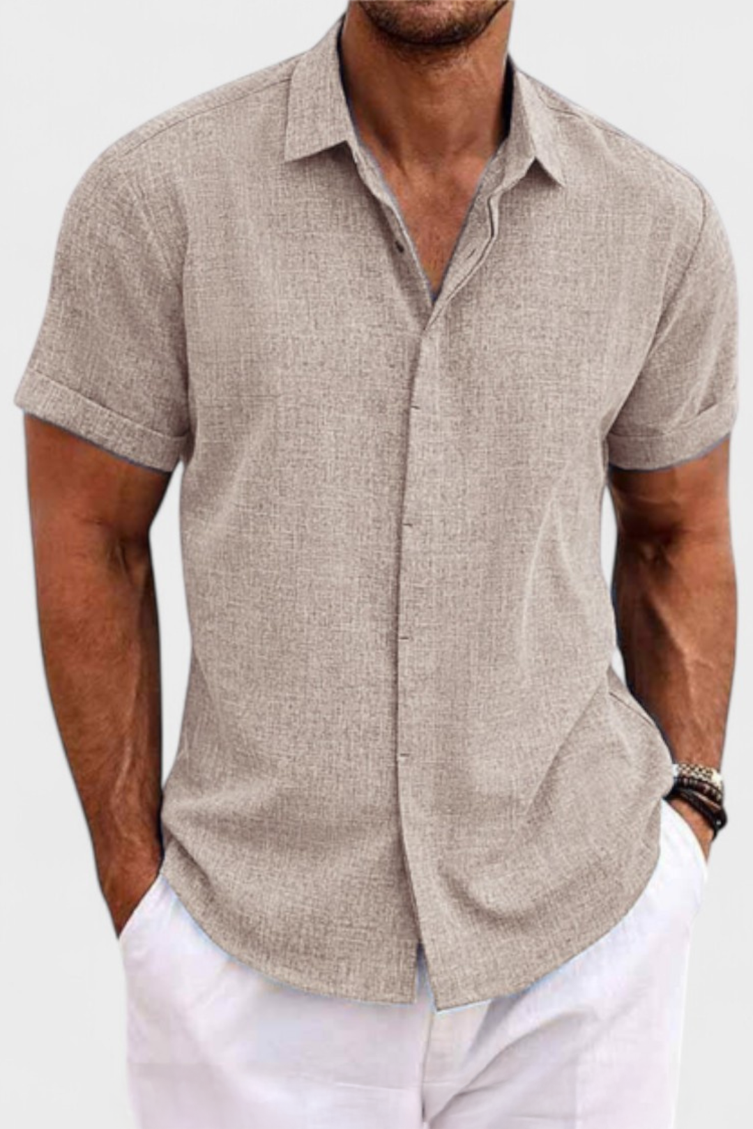 This elegantly tailored short sleeve shirt combines a button-up front with a pointed collar, exuding sophistication in its simplicity. Crafted for warm-weather comfort, its lightweight linen and structured cuffs create a polished look for both casual and refined occasions.
