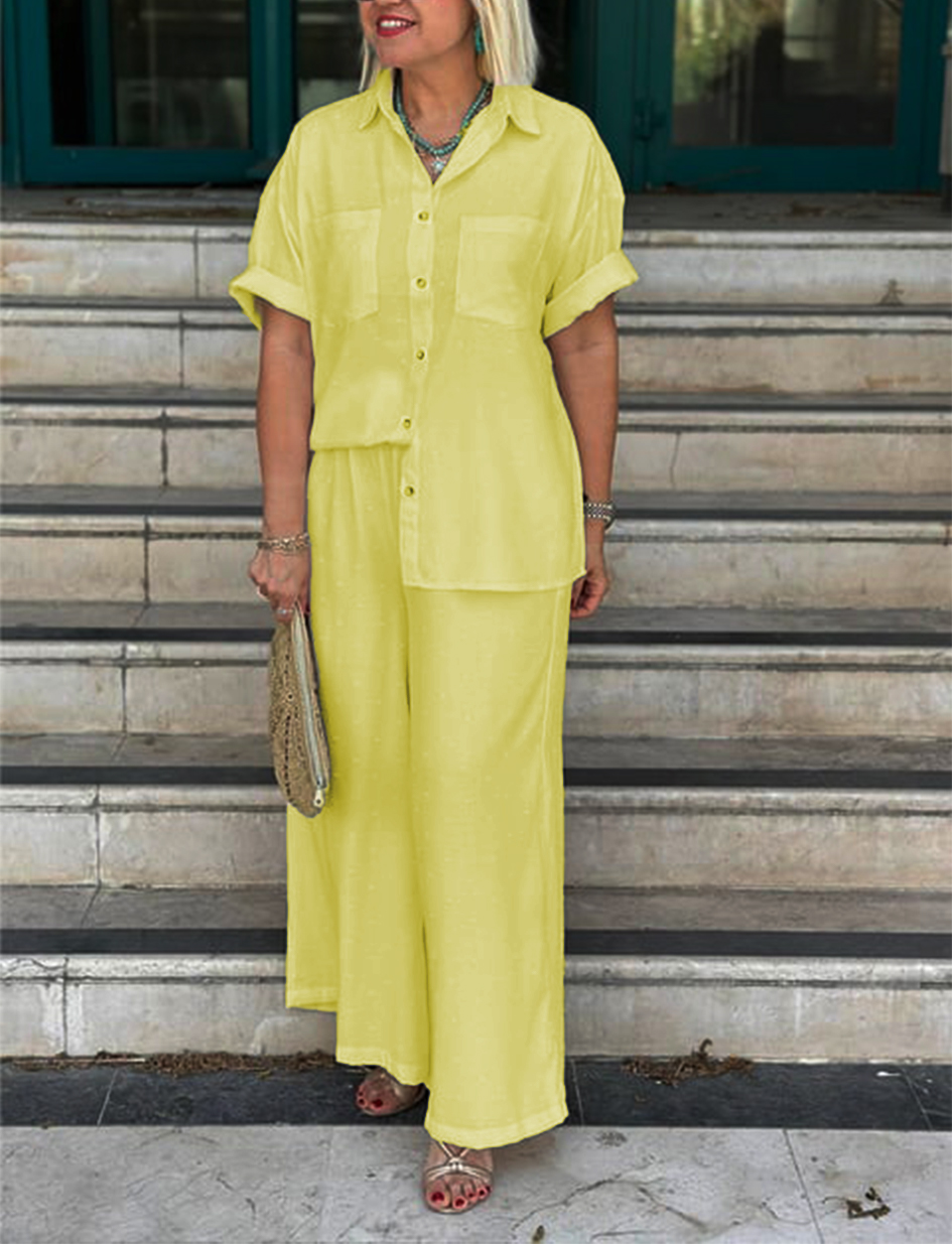 Women's Fashion Two Piece Printed Lapel Button-Down Shirt and Wide-Leg Pants Set