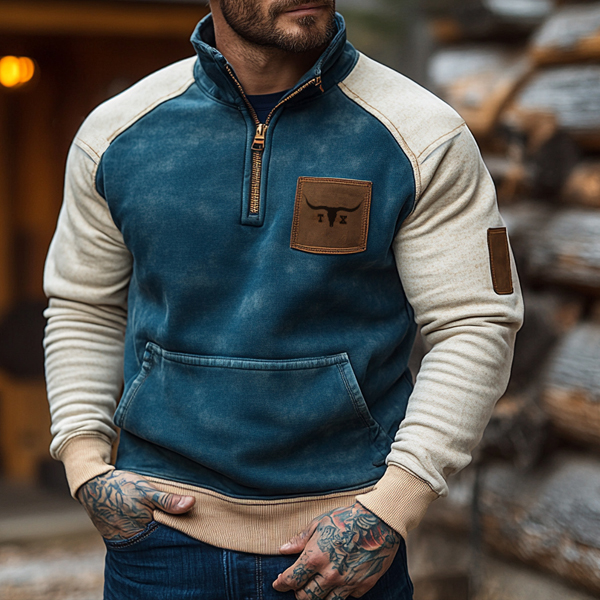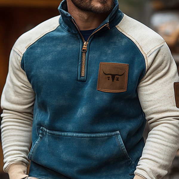 Men's Vintage Texas Bulls Color Contrast Splicing Casual Zipper Stand Collar Pocket Sweatshirts