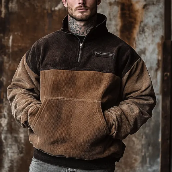 Men's Vintage Ziper Pockets Outdoor Contrast Corduroy Stand Collar Sweatshirt