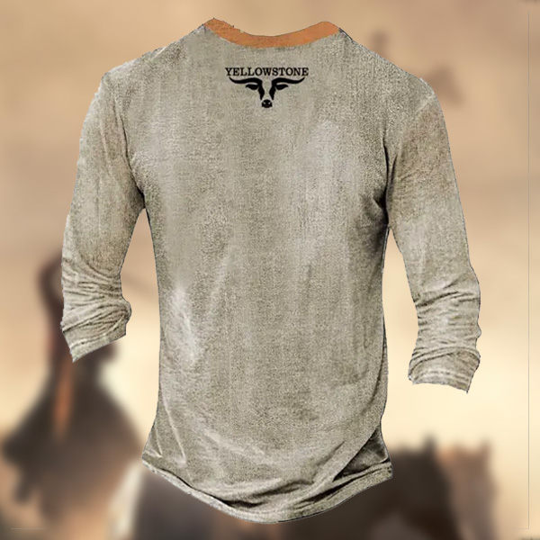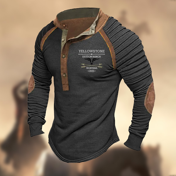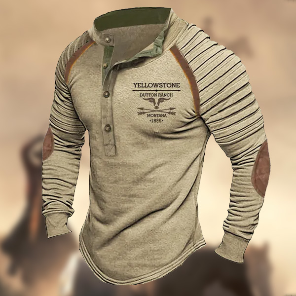 Men's Vintage Yellowstone Western Elbow Patch Henley Stand Collar Long Sleeve T-Shirt
