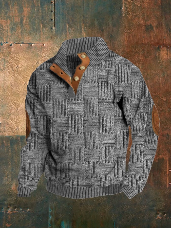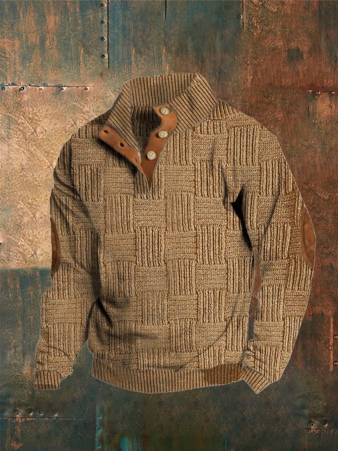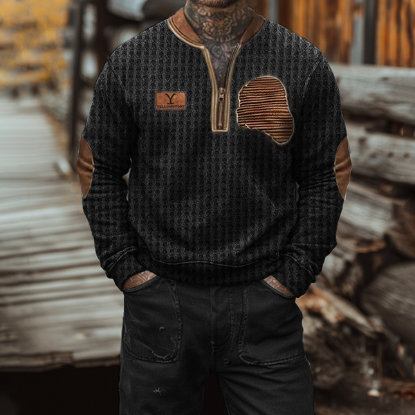 Men's Vintage Waffle Yellowstone Pressed Sleeve Ziper Stand Collar Elbow Patch Sweatshirt