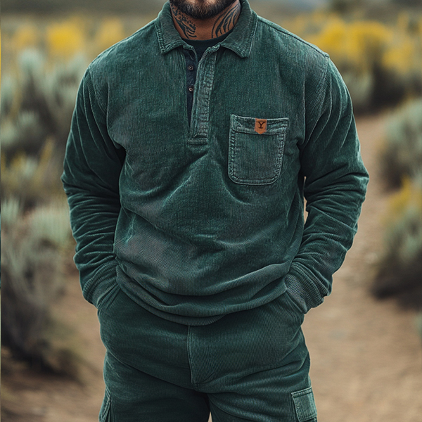 Men's Western Logo Vintage Corduroy Pocket Long Sleeve Henley Collar Polo Sweatshirt