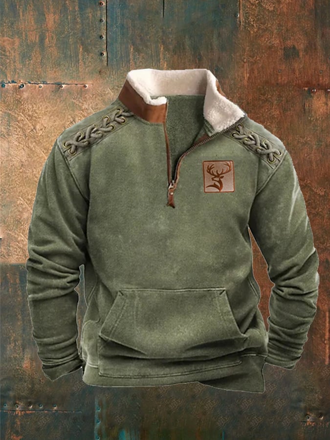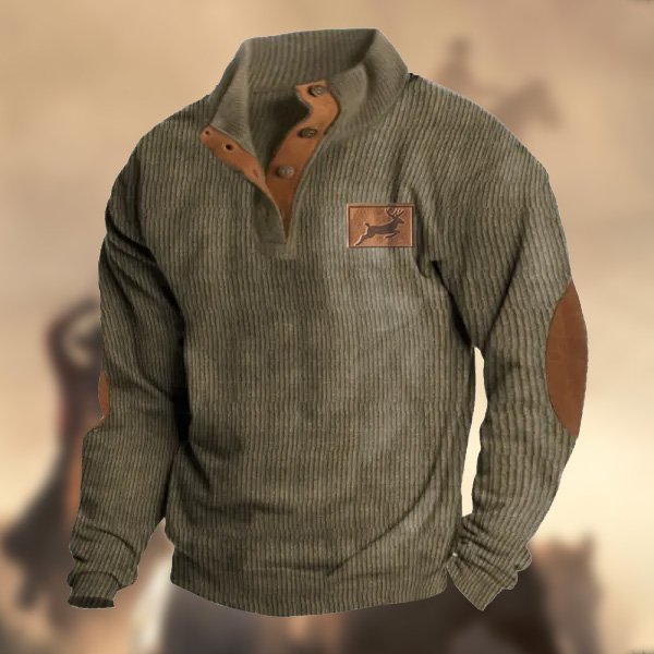 Men's Vintage Cashmere Corduroy Elbow Patch Western Elk Hunting Sweatshirt Outdoor Casual Stand Collar Long Sleeve Sweatshirt