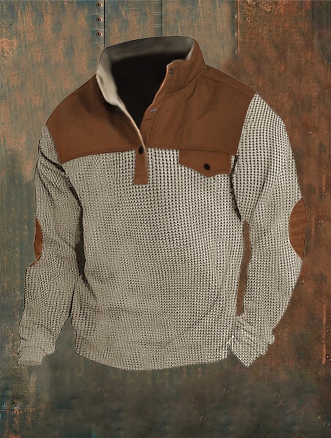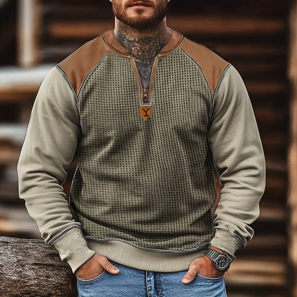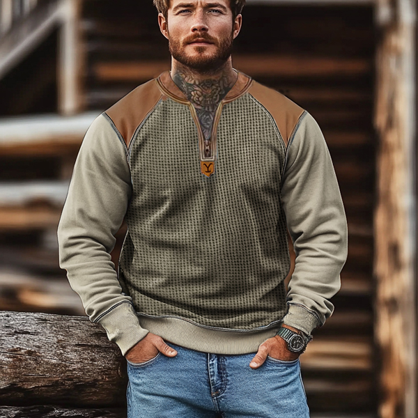 Men's Retro Waffle Herringbone Fabric Splicing Zipper Collar Outdoor Color Blocks Sweatshirt