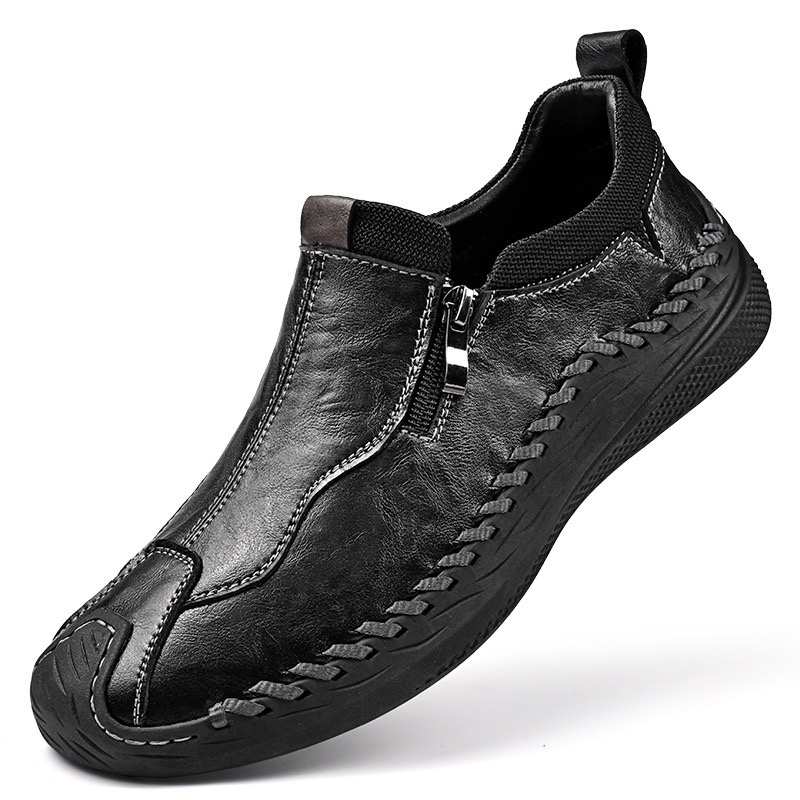 Crafted with a cow leather upper and breathable perforated design, these slip-on shoes keep your feet cool and dry. The flexible elastic opening ensures an easy fit while providing a secure, comfortable feel. The durable rubber outsole offers excellent cushioning, absorbing shock with each step. Paired with breathable, shock-absorbing insoles, they provide all-day comfort and support, making them perfect for work, travel, or even as home slippers. Ideal for any occasion or terrain.