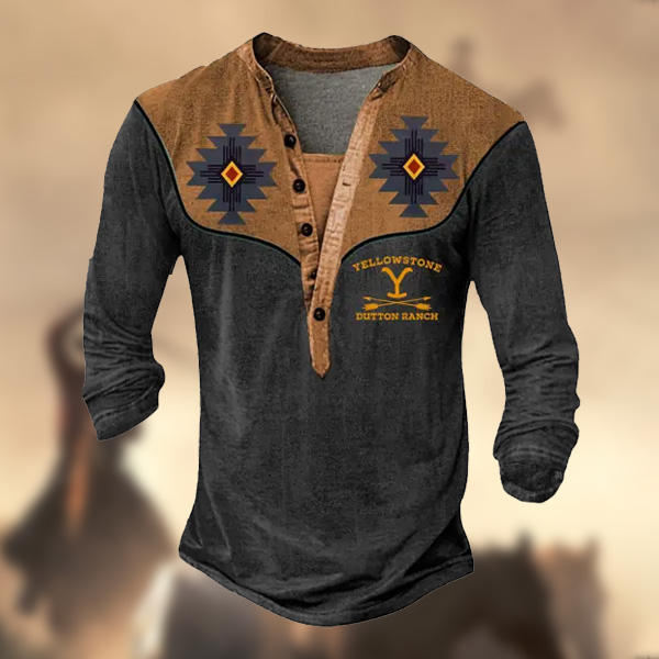 Men's Vintage Yellowstone Aztec Henley Print Long Sleeve T-Shirt