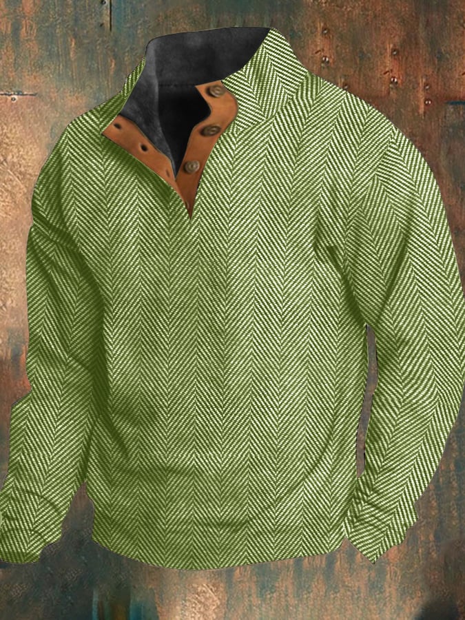 Men's Western Vintage Herringbone Print Design Stand Collar Button-Down Sweatshirt