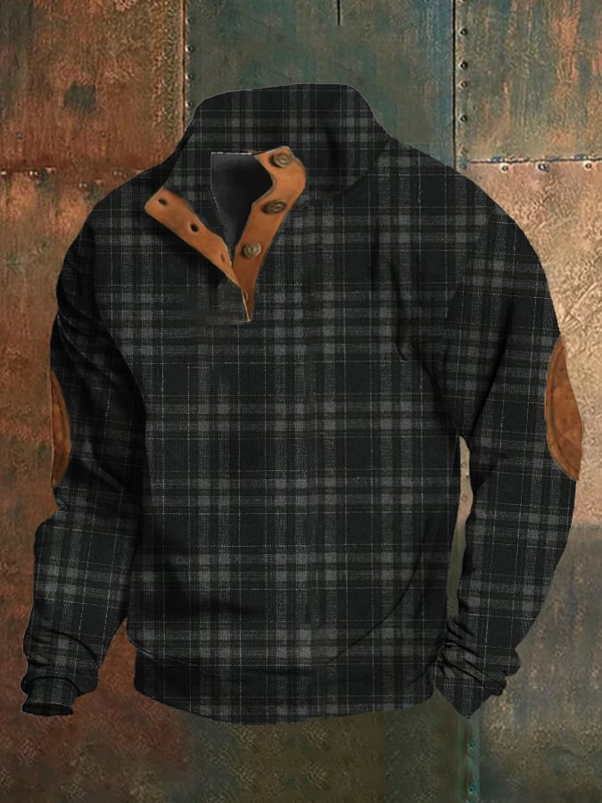 Men's Western Vintage Plaid Print Stand Collar Button-Down Sweatshirt