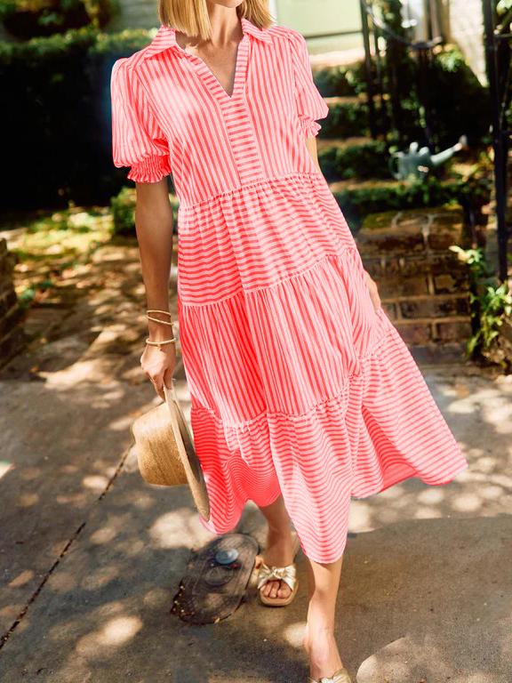 The V-Neck Pleated Short Sleeve Striped Shirt Dress is a delightful blend of sophistication and sweetness that's perfect for any occasion. Falling gracefully at midi-length, this dress exudes timeless charm, making it an ideal choice for both casual outings and special events. The dress features a classic collar, adding a touch of elegance, while the smocked short puff sleeves provide a playful and feminine twist.