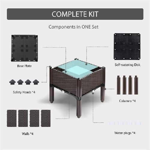 The self-watering elevated garden planter comes with complete accessories for quick and easy assembly. Just mount the self-watering disk, side plate, columns and the small parts.