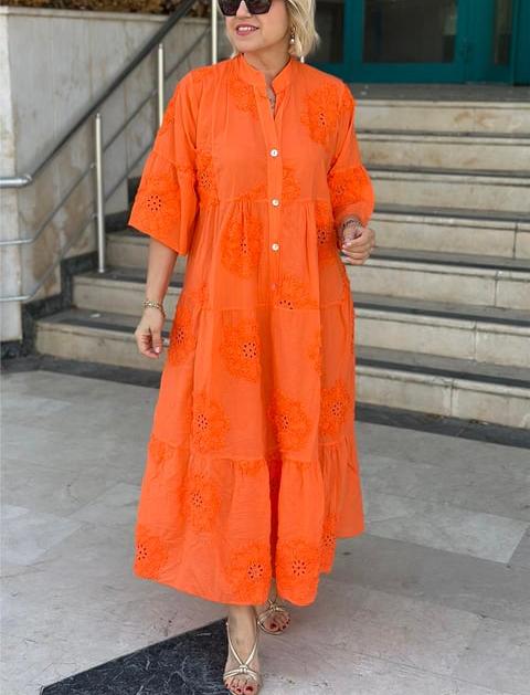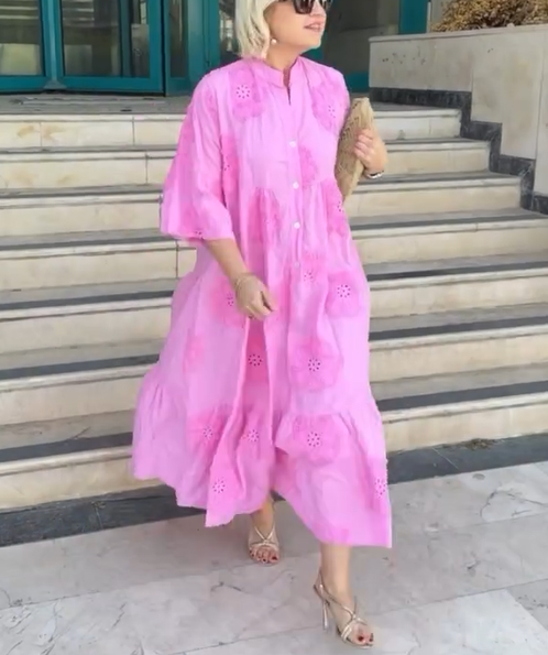 Introducing our Solid color imported embossed scallop cotton dress, designed for the modern woman who values sophistication and style. This dress features a stunning print and elegant maxi length, making it perfect for any occasion.