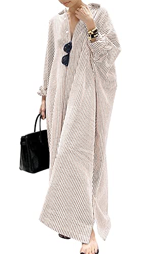 Women's Casual Long Sleeve Button Down Loose Striped Cotton Maxi Shirt Dress