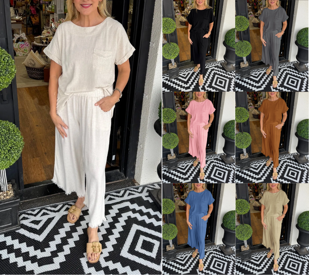 Unwind in style with our cozy cotton linen lounge set. Crafted for ultimate comfort, this set is perfect for lounging at home or running errands in effortless style. Treat yourself to the luxurious feel of our soft and breathable loungewear.