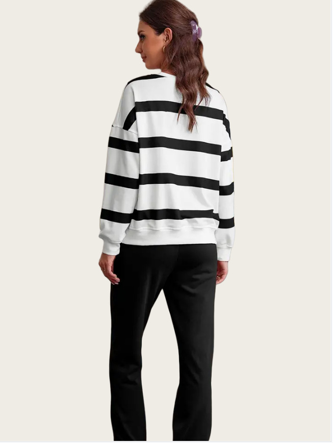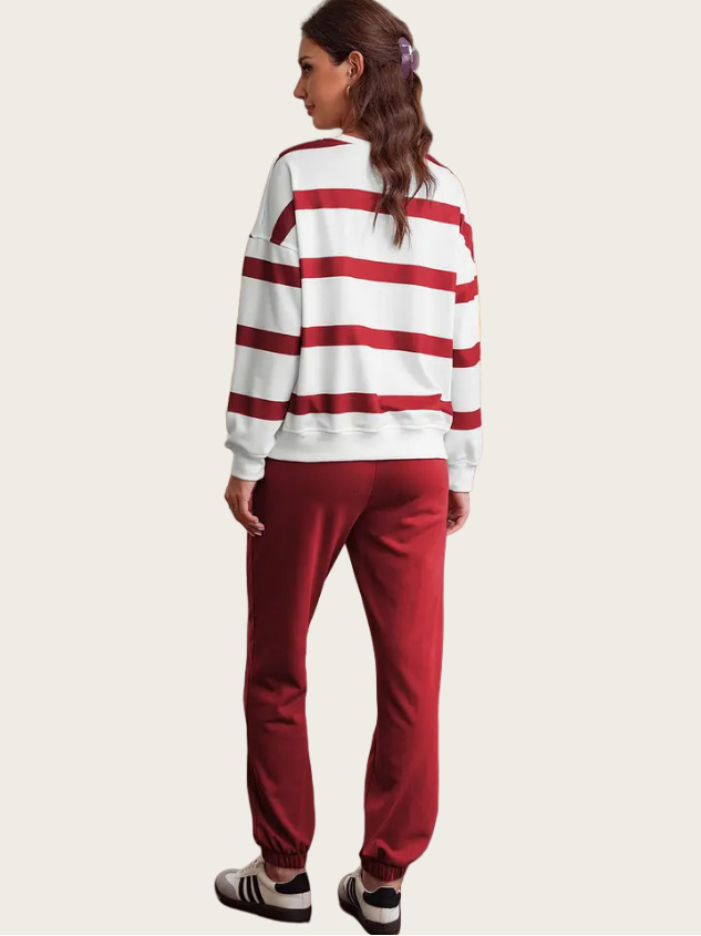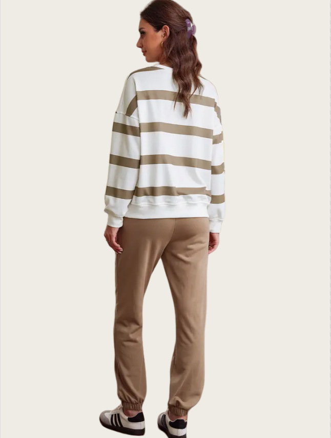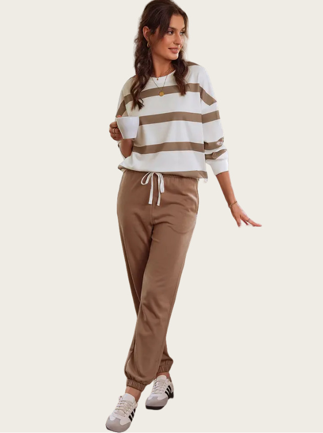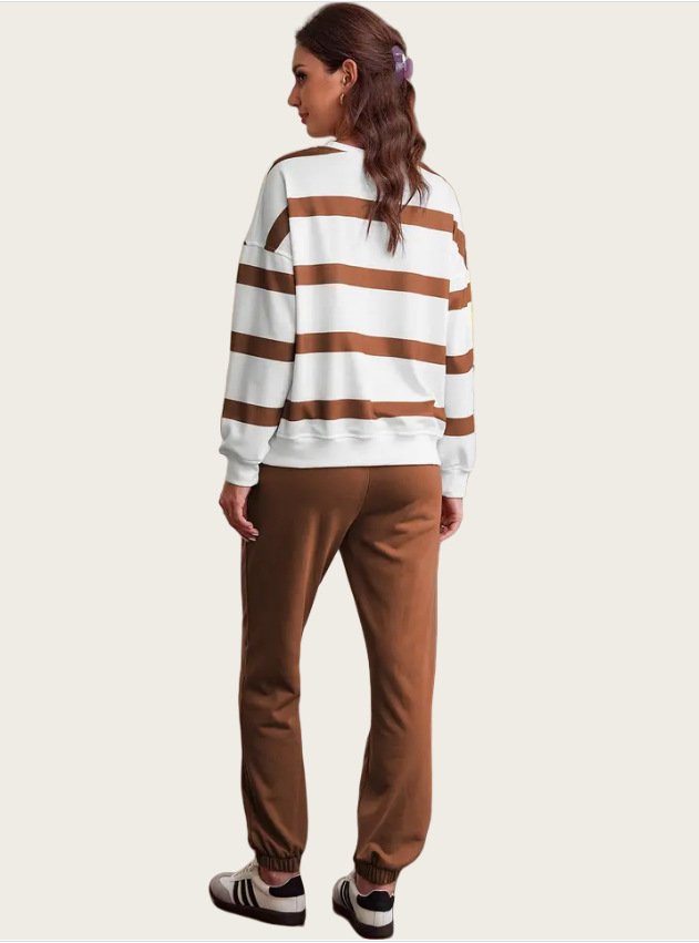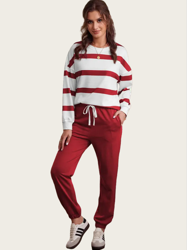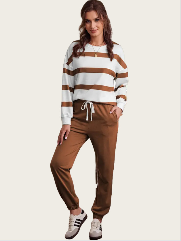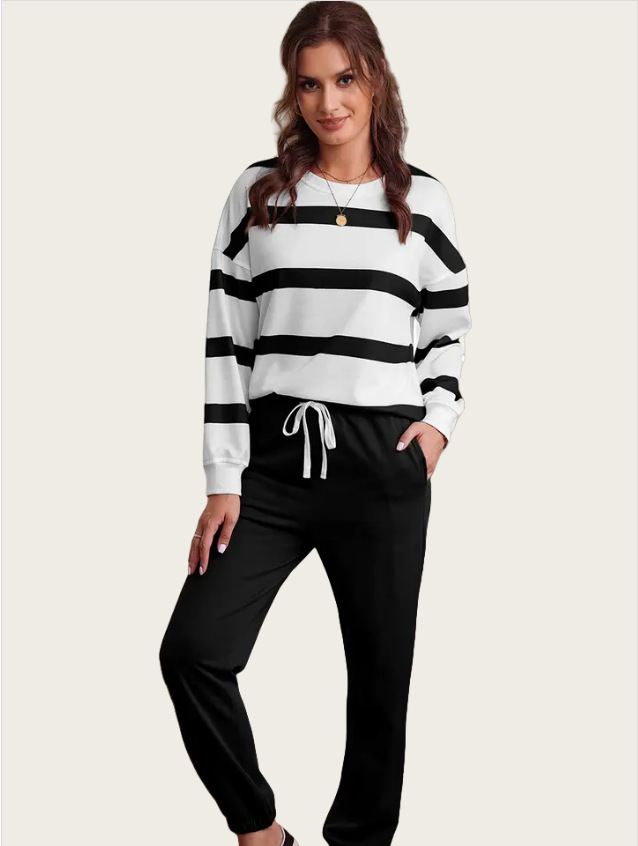 This outfit combines functionality with fashion. The drop shoulder design offers a relaxed fit, while the jogger pants provide ease of movement. Pair it with your favorite accessories for a complete look. Stay stylish and comfortable all day long. The striped design adds a touch of style to your everyday wear.